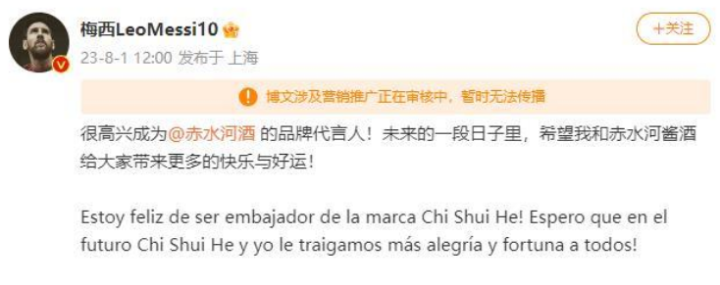 事实上,照片公布不久,梅西通过个人官方微博宣布:“很高兴成为赤水河酒的品牌代言人!未来的一段日子里,希望我和赤水河酱酒给大家带来更多的快乐与好运。证实了自己的确与赤水河酒的合作。