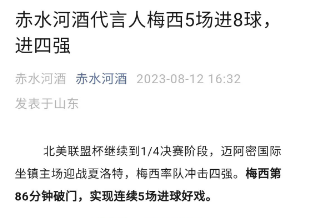 官宣梅西代言后,赤水河酒公众号和官网的访问量大增,他们也没有放过任何一次借助梅西宣传自己的机会,比如梅西率领迈阿密热晋级北美联盟杯8强后,他们快速转发新闻,并在文末表示:作为梅西的亲密伙伴,赤水河酒将与梅西一起,以最严格的要求打造高品质好酒。