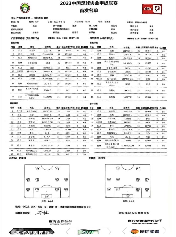 广西平果哈嘹首发:赵旭日, 马特奥斯, 董一凡, 张帅, 高嘉润, 黄新, 孙伟哲, 多诺万-埃沃洛, 安永佳, 王华鹏, 刘柏杨(U21)