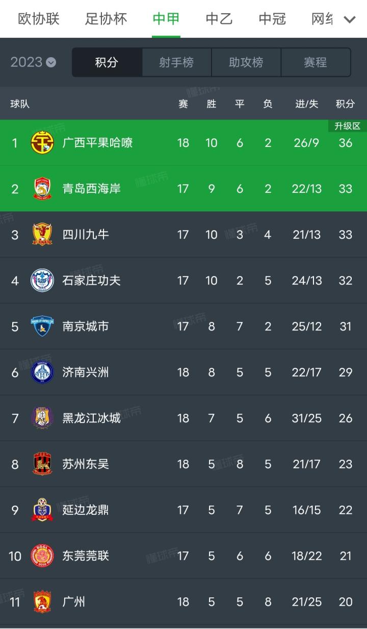 中甲榜单