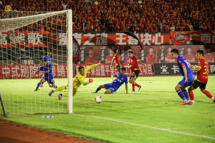 第57分钟,刘柏杨精妙传中,埃沃洛前点虚晃一枪,安永佳门前头槌破门完成传射,广西2-0丹东