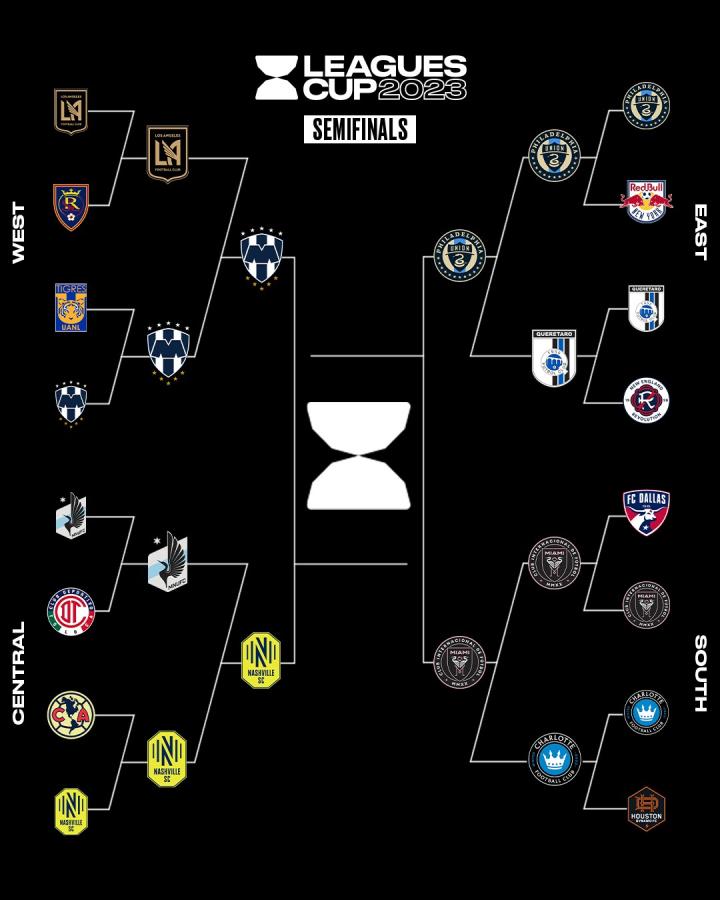 目前,北美联赛杯四强及对阵已出炉,对阵分别是费城联合vs迈阿密国际,蒙特雷vs纳什维尔,半决赛将于当地时间8月15日进行,开球时间待定,三四名决赛和冠亚军决赛将于8月19日开打。