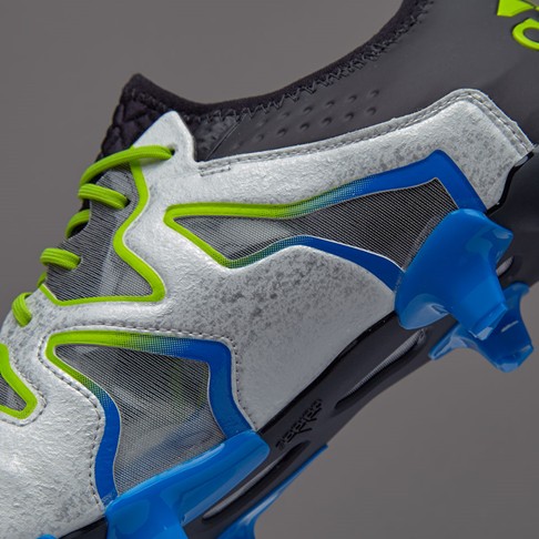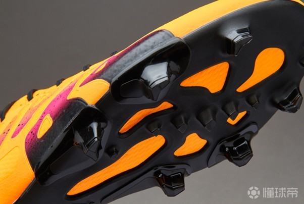 X15.1的另一大黑科技体现隐藏于鞋身中部耀眼花纹处,这其实是Adidas一种全新研发的外置骨架定型结构,而且其名字非常霸气为X-Cage!实际抚摸过这部分X-Cage支撑结构之后,你会充分感受到Adidas制鞋的鬼斧神工之作,脚弓这部分不仅外观亮骚,而且十分轻质柔软,最重要的是让球鞋整体在轻质和稳定性方面取得了双赢的效果。X-Cage设计完全支撑起球鞋的整体架构,并大幅度提升了X15.1球鞋的耐用性。另外,X-Cage部分和鞋带直接相连,所以在系鞋带的同时,你也将整个球鞋紧紧包裹在脚上,这符合阿迪达斯提倡的“完美贴合”的概念,使得双脚不会轻易滑动,一切的设计都为实战而考虑。