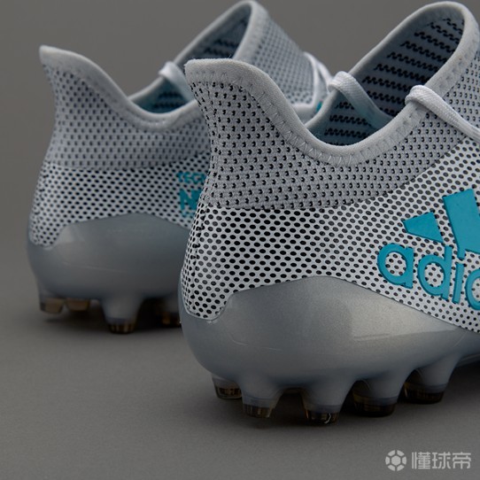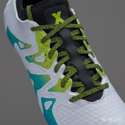 X17.1足球鞋在鞋楦设计上倒是和前代几乎无异,前掌内仓还是一如既往的紧致,但是中间因为内部支撑被保留的缘故,弹性的进步是比较明显的,所以会相对好穿一点,也稍微容易穿开一点,可是奉劝大宽脚的朋友还是要注意一下。至于X17.1的鞋领和后跟设计基本和前代是一样的,最多也就是面料的扩散位置稍微大了一点。后跟的Heel Lining固定技术被全盘保留,摩擦块附着的设计保证了在极致包裹的情况下,同样有效防止了球鞋的可能滑动,整体舒适无比!X17.1的鞋领设计保留了TechFit超柔软以及低密度的人造材料,完全的附着在使用者的脚踝之上,有效防止了踢球时杂物的进入,提供了无与伦比的包裹性。不过TechFit材料延伸至鞋带处的设计还是很有新意的,同时改进了球鞋的透气性以及重量负担,比较合适的保留。