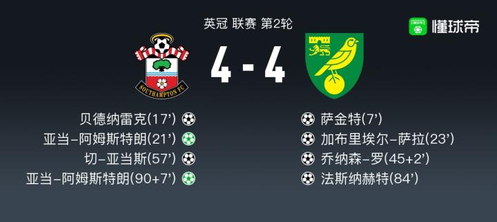 北京时间8月12日英冠 联赛 第2轮,南安普顿主场对阵诺维奇。南安普顿贝德纳雷克破门,切-亚当斯破门,亚当-阿姆斯特朗梅开二度。诺维奇萨金特破门,加布里埃尔-萨拉破门,乔纳森-罗破门,法斯纳赫特破门。最终比分4-4。