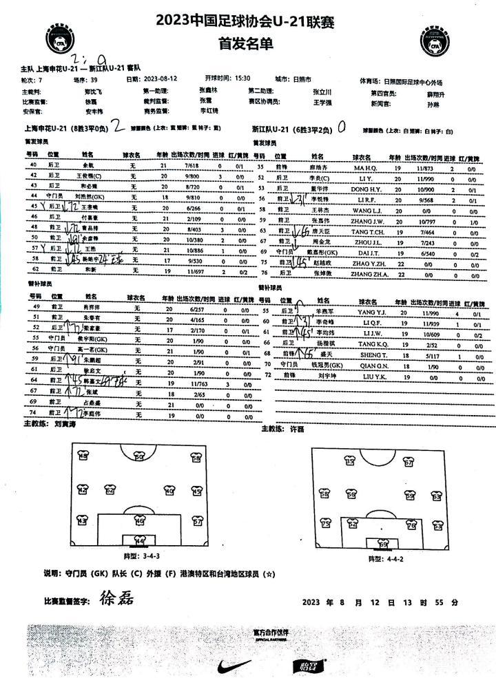 启程2023·U21联赛|杨皓宇韩嘉文分别建功 上海申花2-0浙江队 北京时间8月12日15:30,2023中国足球协会U-21联赛决赛第二阶段第7轮上海申花与浙江队的比赛在山东日照国际足球中心进行。上半场第23分钟,杨皓宇前场抢断后破门。下半场第70分钟,韩嘉文内切远射打入死角,申花扩大领先优势。比赛尾声阶段,申花门将刘浩然奉献精彩两连扑力保城门不失。 最终,上海申花U21队2-0战胜浙江队U21。8月14日10:00,目前5胜2平积17分位列第二的上海申花将对阵暂列榜首的山东泰山U21。