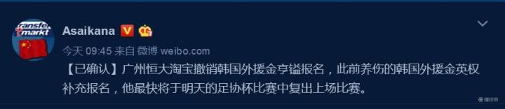微博原文为:“【已确认】广州恒大淘宝撤销韩国外援金亨镒报名,此前养伤的韩国外援金英权补充报名,他最快将于明天的足协杯比赛中复出上场比赛。”