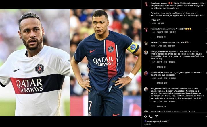 博主发姆巴佩称自己和内马尔无法共存,内马尔点赞