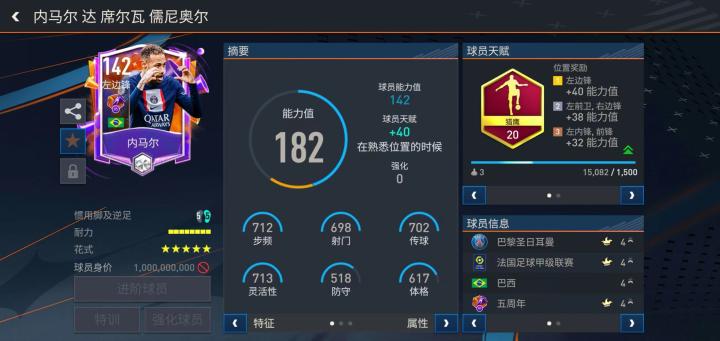 内马尔在五周年活动中推出了一张基础能力值142的五周年明星球员卡。天赋配备了猎鹰,对他的边路冲击力和盘带突破能力都有很大的提升,再加上内马尔高效的内切,他是一名顶级的边路持球进攻专家。