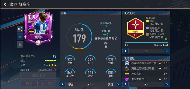 凯塞多在此前的未来之星系列中推出了一张基础能力值139的球员卡。司职中前卫的他配备指南针天赋,对他的组织能力和盘带能力有很大提升,这让本就防守出色的凯塞多,在进攻端的发挥更加全面。