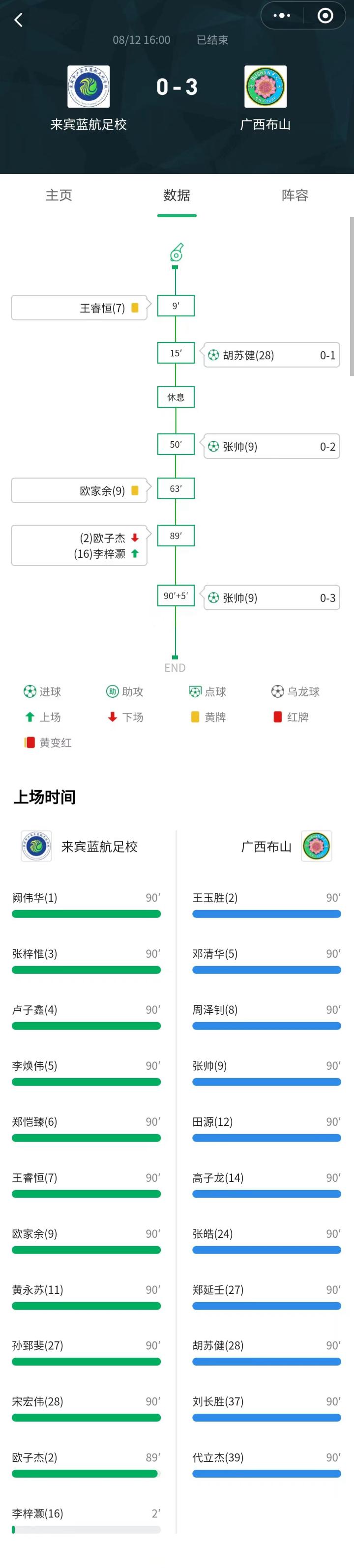 本场比赛广西布山反客为主,第15分钟,胡苏健为广西布山首开纪录,之后张帅上下半场各入一球,最终广西布山3-0主场击败来宾蓝航足校。