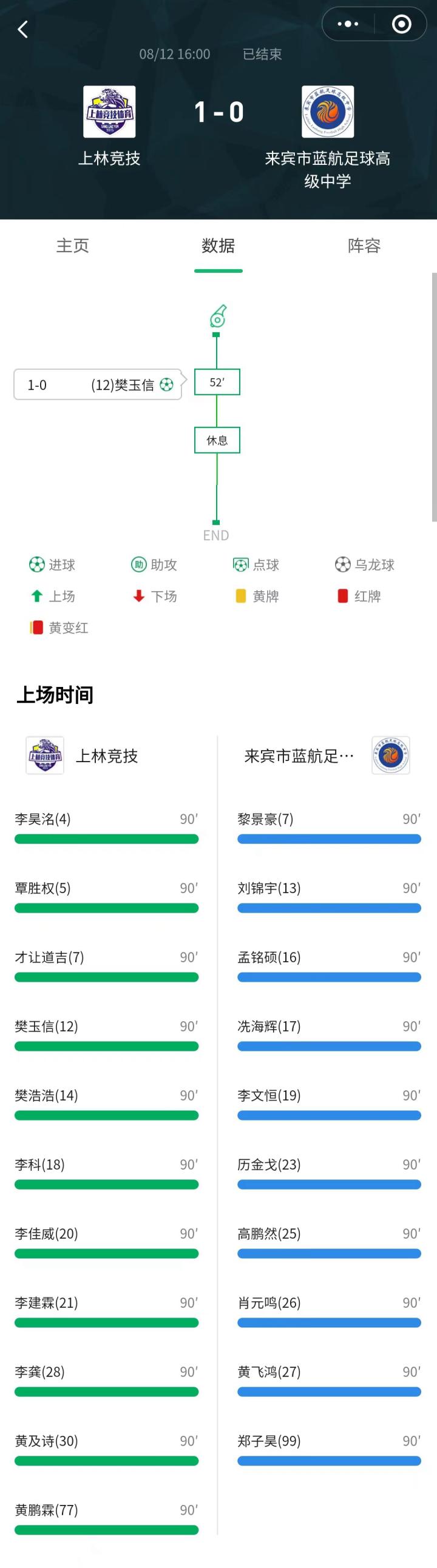 8月12日16:00,上林县民族综合高中,上林竞技主场对阵来宾蓝航足高,最终凭借樊玉信第52分钟的进球,上林竞技1-0击败来宾蓝航足高。