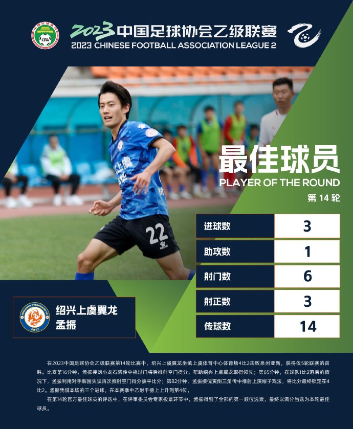 北京时间8月15日,中乙联赛官方宣布,绍兴上虞翼龙球员孟振当选第14轮最佳球员。