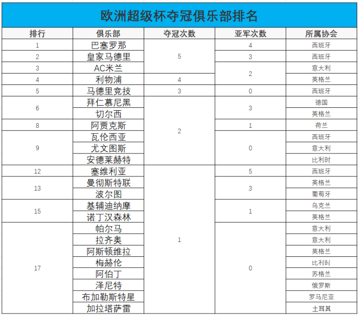 AC米兰、巴塞罗那与皇家马德里分别5次赢得欧洲超级杯冠军,是夺冠次数最多的三支球队。