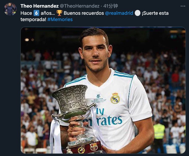特奥晒2017年西超杯夺冠照片:6年前的今天,美好的回忆。祝皇马本赛季好运。