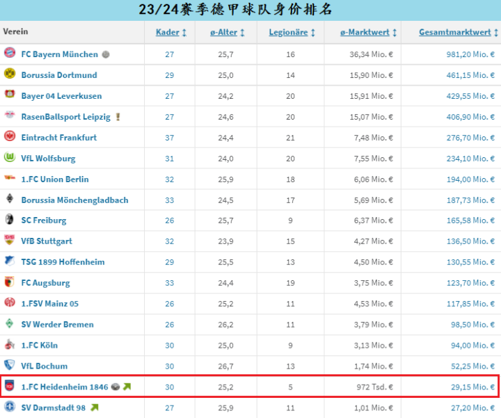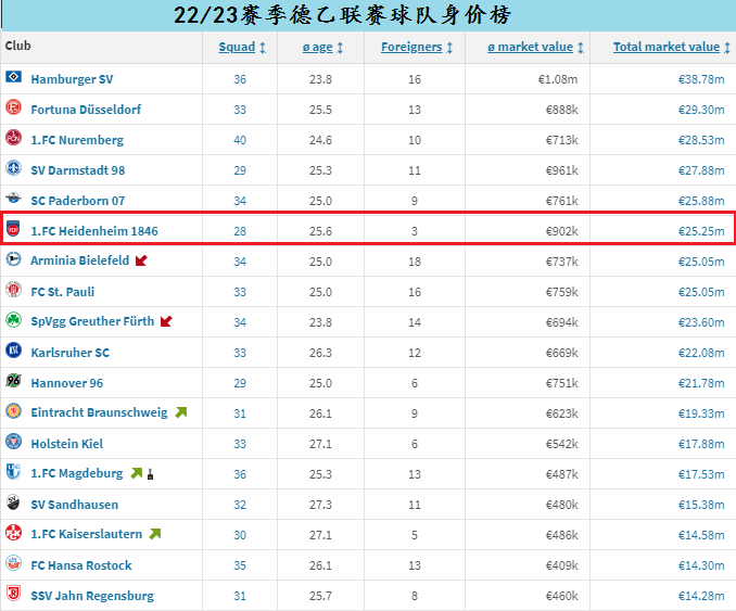 22/23赛季的海登海姆一线队只有28名注册球员,是上赛季一线队球员人数最少的德乙球队,总计身价约为2525万欧元,只能排在上赛季德乙球队身价榜的第6位。