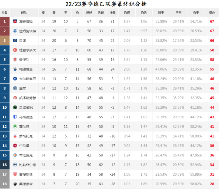 并非夺冠热门的海登海姆在上赛季却交出了攻防俱佳的优秀表现,整个赛季打进了67个联赛进球,位列德乙进球榜第3,丢球数为36个,位列德乙第二。海登海姆在上赛季德乙中只输掉了5场比赛,是输球场次最少的球队,此外19场联赛胜利也是上赛季德乙中赢球场次第二多的球队。