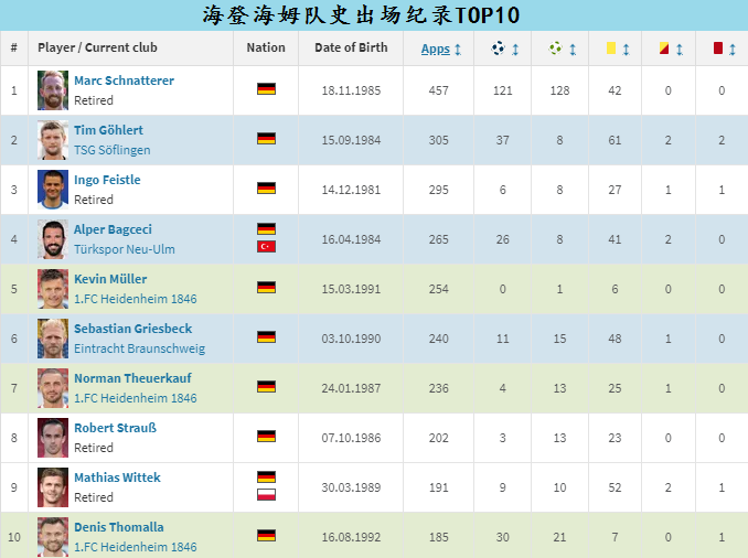 位列俱乐部历史出场榜首位的是俱乐部传奇前锋施纳特雷(已退役),这位本土前锋在海登海姆效力长达13年时间,共计为球队出场457次,打进121个进球,助攻128次。施纳特雷在13/14赛季帮助球队拿到了德国丙级联赛的冠军。