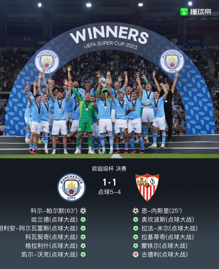 曼城点球大战总分6-5塞维利亚夺超级杯冠军,帕尔默破门救主