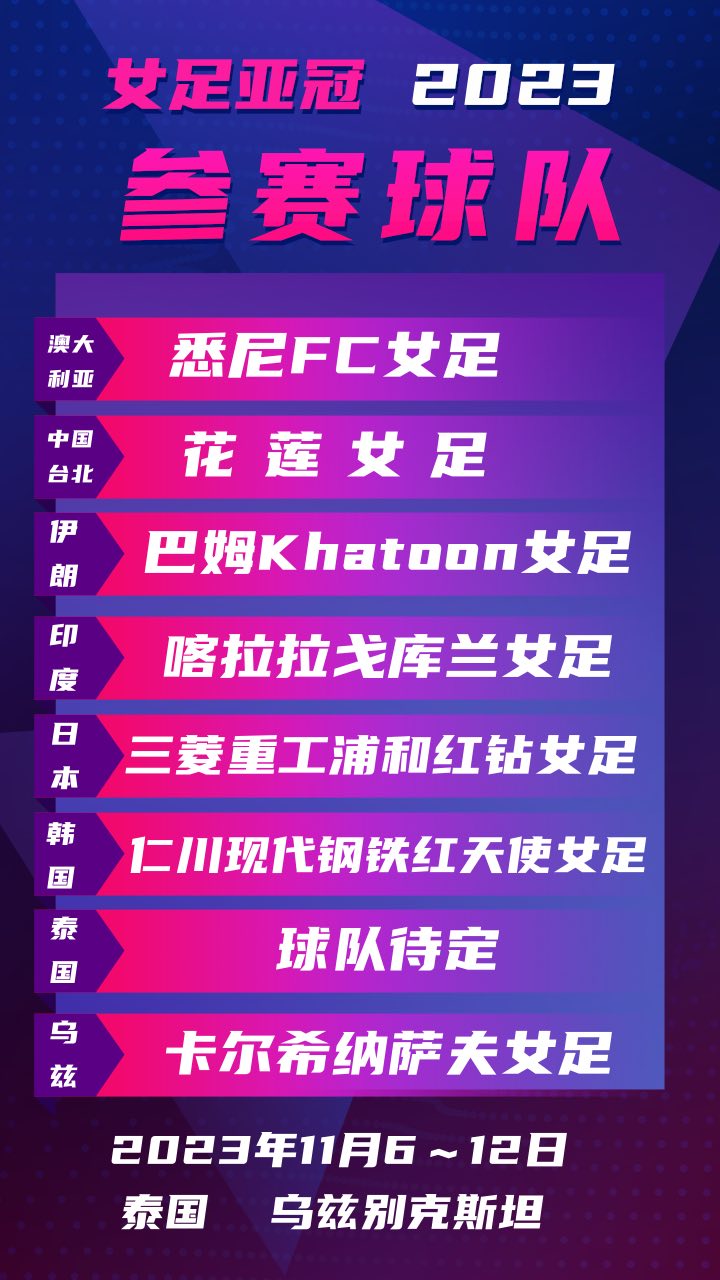 【2023亚足联女子俱乐部锦标赛-邀请赛】 本次赛事将作为2024年亚冠女足联赛的预赛进行,届时将决出亚洲第一的女足俱乐部。 具体详情将于9月7日在亚足联总部抽签决定。 主办国:泰国、乌兹别克斯坦 比赛日期:2023年11月6日-11月12日 参赛俱乐部: 悉尼(澳大利亚) 花莲(中国台北) 巴姆Khatoon(伊朗) 喀拉拉戈库兰(印度) 三菱重工浦和红钻(日本) 仁川现代钢铁红天使(韩国) 待定(泰国) 卡尔希纳萨夫(乌兹别克斯坦)