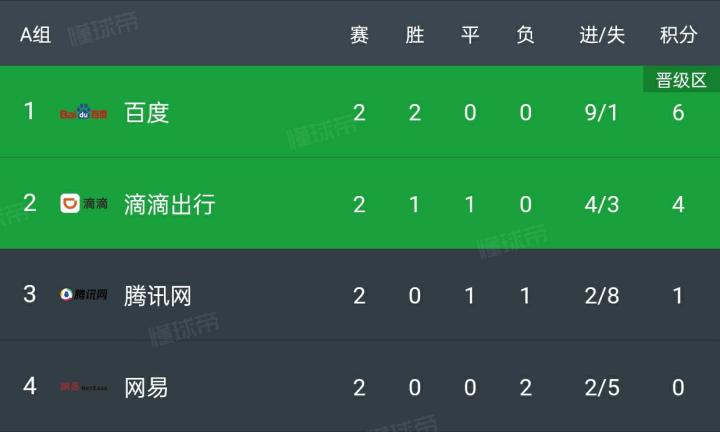 两轮比赛过后,A组由百度两战全胜领跑积分榜,且已提前锁定出线名额,下一轮只需战平滴滴出行即锁定小组头名。而滴滴出行目前一胜一平积4分,若战胜百度则能反超对手以小组第一出线,战平则锁定小组第二,而如若不敌对手且腾讯网战胜网易,那么两队将以比较净胜球的方式决出小组第二。