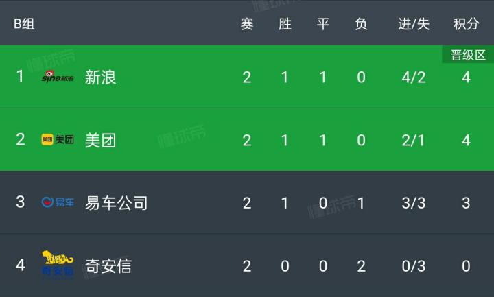 B组的晋级形势较为复杂,新浪、美团与易车公司均有可能在末轮晋级或遭到淘汰。目前同积4分的新浪与美团若能在末轮战平对手便将至少锁定一个小组出线名额,易车公司积3分暂时位列第三,末轮对阵美团须全力争胜力求出线。