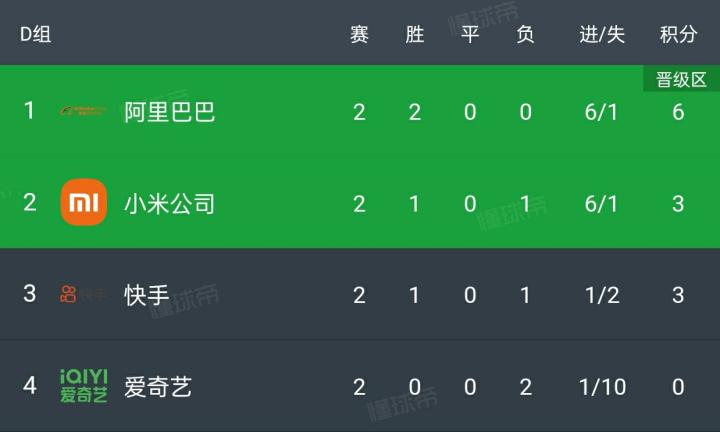 形势最为复杂的一组来了,阿里巴巴、小米公司、快手以及爱奇艺四支球队均有在末轮出线的可能!目前两战全胜的阿里巴巴将在末轮迎来与小米公司的直接对话,若阿里巴巴保持不败便将以小组头名晋级。