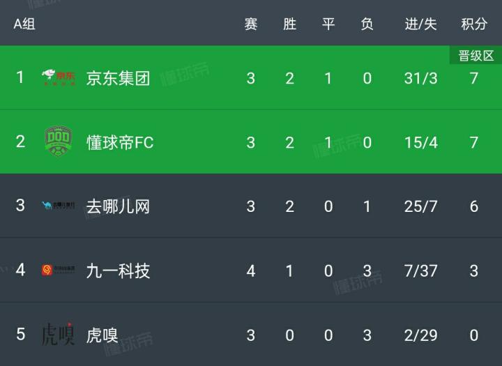 A组由5支球队共同争夺两个出线名额,目前京东集团、懂球帝FC与去哪儿网均有出线机会,京东以大量净胜球优势暂居小组第一。末轮比赛中,京东与懂球帝均只需平局即可出线,而去哪儿网若能在这场出线“生死战”中战胜京东,便将反超对手成功晋级。