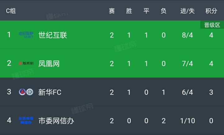 C组目前的积分分布情况同样为4/4/3/0,世纪互联将在最后一轮与新华FC直接竞争一个小组出线名额,目前积4分的他们只要不败即可出线。另一边,凤凰网对阵市委网信办若能取胜且拿下较多净胜球,便可能在最后一轮反超升至小组第一。