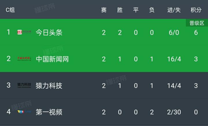 C组的情况与B组十分类似:今日头条两战全胜已锁定小组第一提前出线,中国新闻网以2粒净胜球优势暂排名小组第二,末轮将与猿力科技争夺小组第二的出线名额。