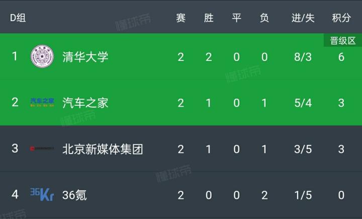 D组目前同样是6/3/3/0的积分分布,清华大学先后对阵汽车之家与北京新媒体集团取得两战全胜,目前积6分提前锁定小组头名。汽车之家与北京新媒体集团同为一胜一负,末轮将迎来出线生死大战。