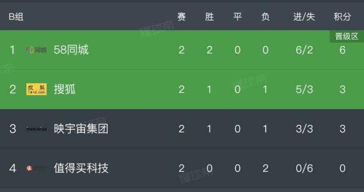 再看来看看B组的情况:先后对阵映宇宙与搜狐实现两战全胜的58同城已提前锁定小组第一名,末轮无论结果如何均能出线。而映宇宙集团与搜狐将展开一场“谁赢谁出线”的关键较量,而若两队战平,搜狐将凭借第一阶段净胜球优势实现晋级。