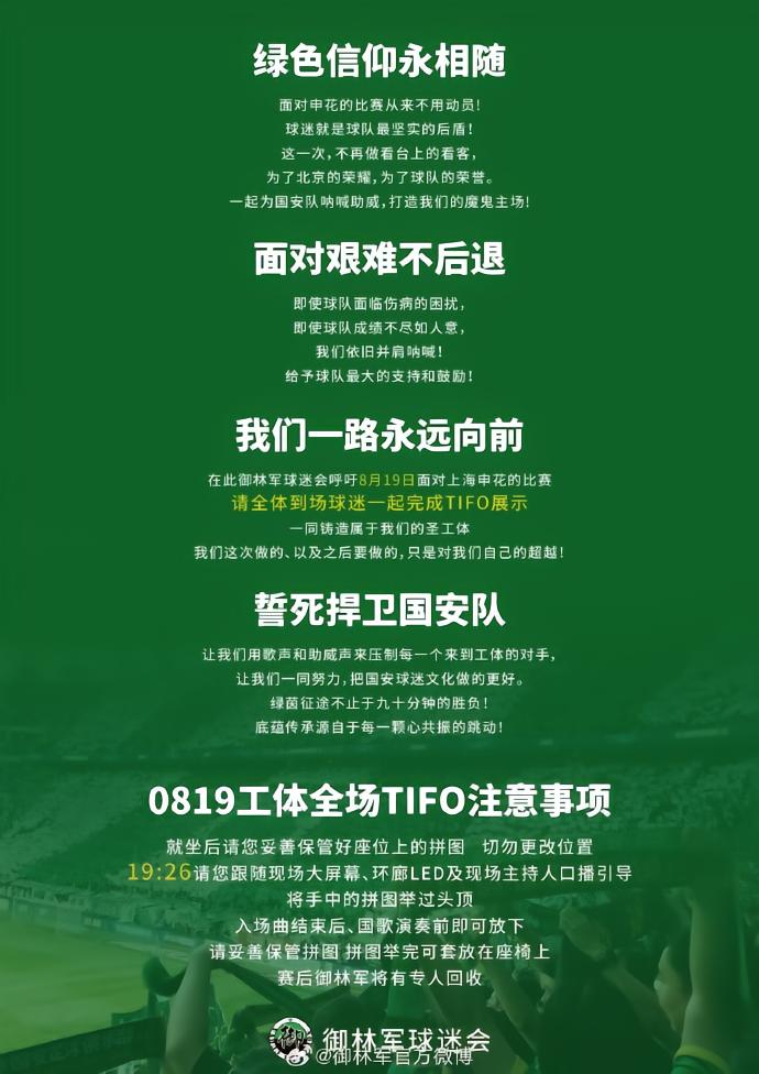 御林军官方:京沪大战将设全场TIFO,呼吁球迷一起完成展示sEliauk @懂球帝2023-08-17 20:19据国安球迷组织“御林军”官方消息,京沪大战将设全场TIFO,呼吁球迷一起完成展示。(资料图)图源见水印此前国安官方介绍称,御林军球迷会计划于本场比赛赛前进行整体的TIFO展示活动。请球迷积极配合,不要随意挪动,在入场仪式开始前,将拼图举过头顶。赛后回收时请将拼图展平带至看台口,请不要用作垃圾袋或与垃圾混装。“御林军”球迷会发文呼吁来源见水印展开更多