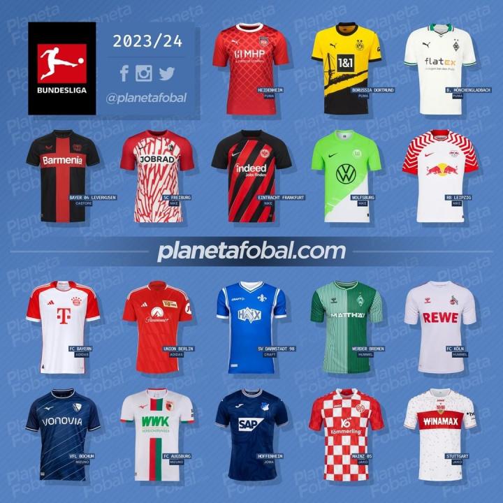 德甲2023-24赛季各俱乐部主场球衣。