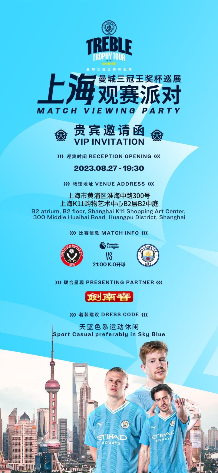 在这样一个历史性的时刻,作为曼城足球俱乐部全球白酒唯一合作伙伴的剑南春也为全中国城迷带来了惊喜福利:此次曼城三冠王奖杯巡展活动期间,剑南春联合曼城足球俱乐部,将分别于杭州(8月26日)、郑州(8月29日)以及天津(9月1日)举办三场“剑南春曼城三冠王奖杯VIP晚宴”。