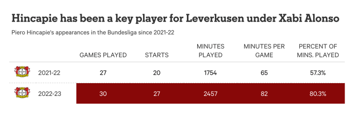2021/22赛季是因卡皮耶的德甲处子赛季。从一线队的一名常规球员上升为有保障的首发球员,这在很大程度上与勒沃库森的换帅有关——去年10月,哈维·阿隆索接过了塞瓦内的教鞭,厄瓜多尔人非常适合西班牙少帅的战术要求。在阿隆索治下,因卡皮耶共出战37场比赛,其中有33场首发出场,他缺席的比赛都是因为停赛。