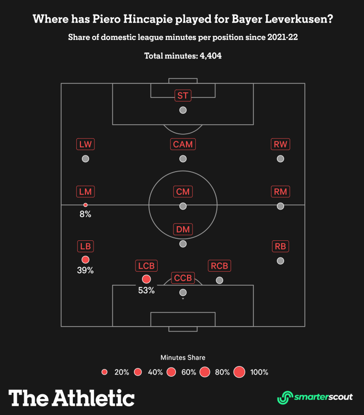 2021/22赛季是因卡皮耶的德甲处子赛季,他总共出场4404分钟。其中他担任左中卫的时长占比53%为最高,39%的时间踢左后卫,8%踢左中场。