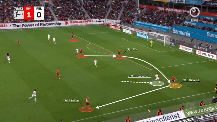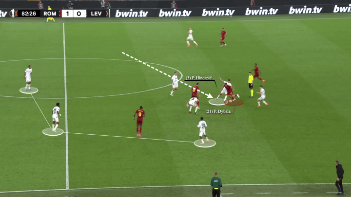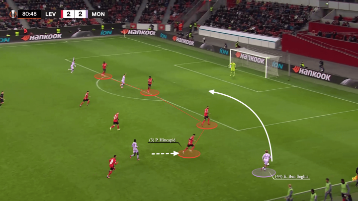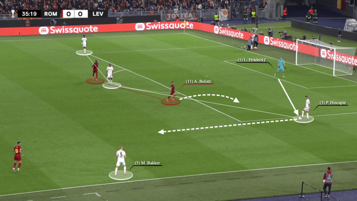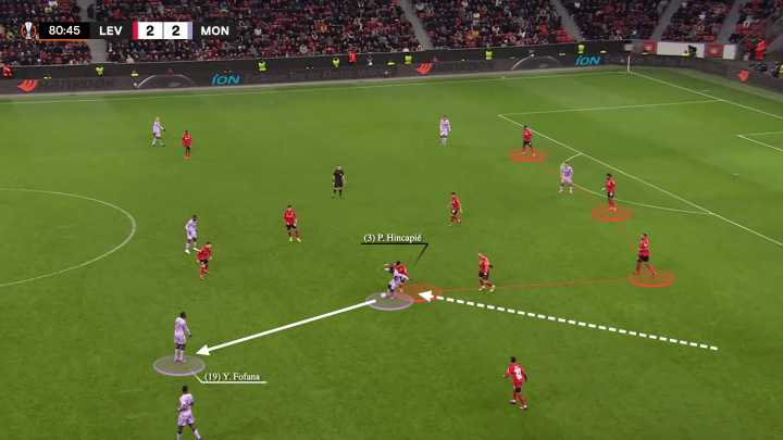 勒沃库森的3-4-3阵型通常很宽,可能让中后卫暴露,这需要他们做出快速的决定,以阻止或终结对方的反击。就像贝尔萨式风格那样,有时需要防守球员去盯防(man-mark)。但因卡皮耶在长距离跟防一名对方球员的时候,有多次在在内场或前场的犯规——他们没有构成任何威胁,面对的是自己的球门,但他却很笨拙,选择了从他们身后犯规: