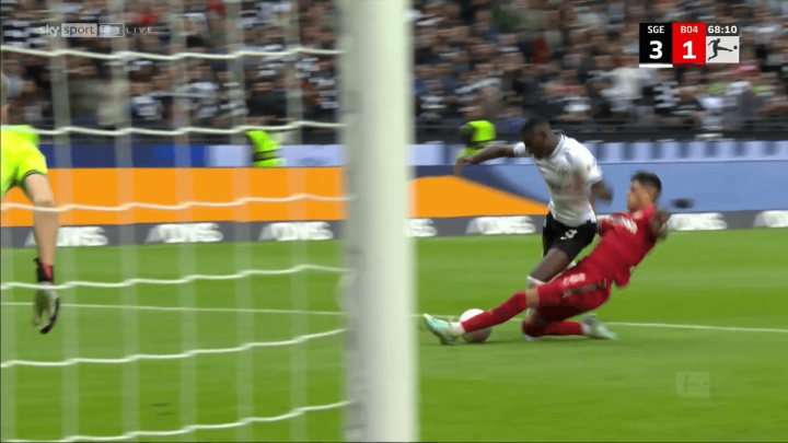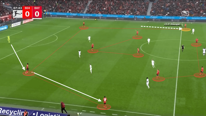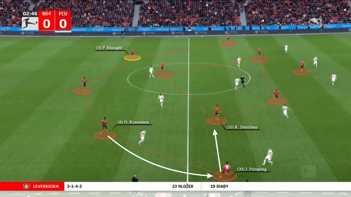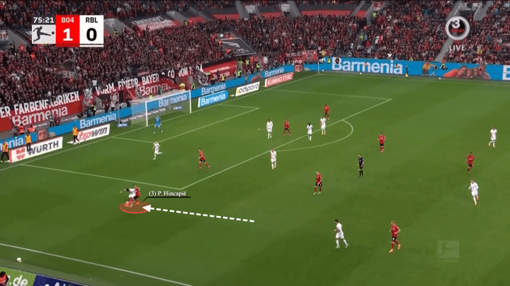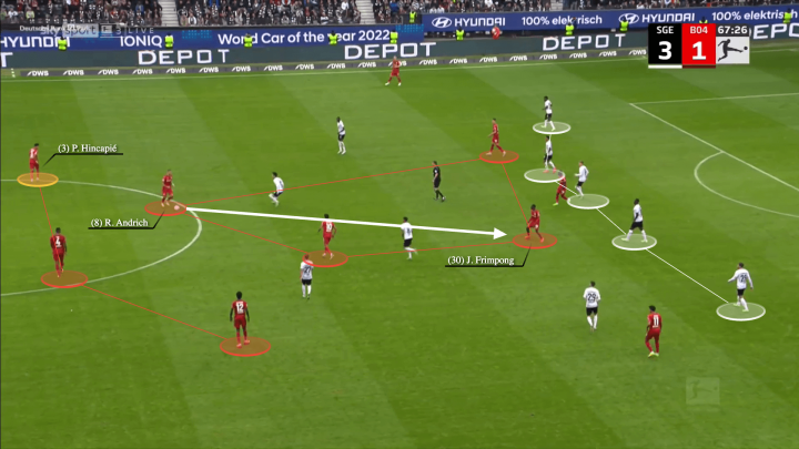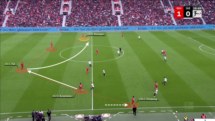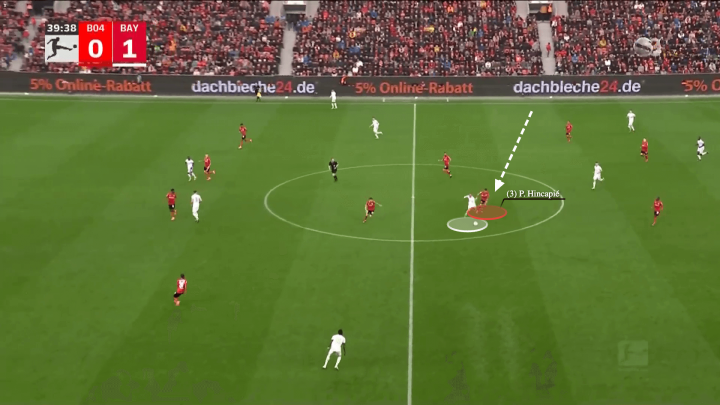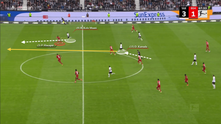 4月份,勒沃库森主场3:1战胜法兰克福,因卡皮耶又处在左翼卫的位置上,不过相较于另一侧的弗林蓬,因卡皮耶更多地承担了防守职责: