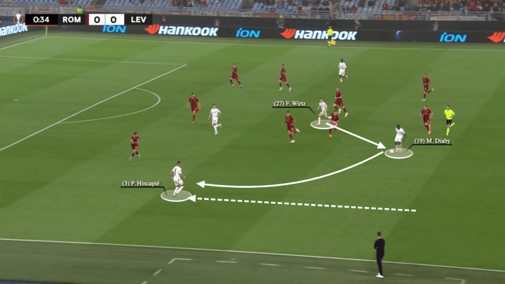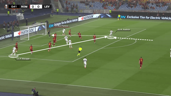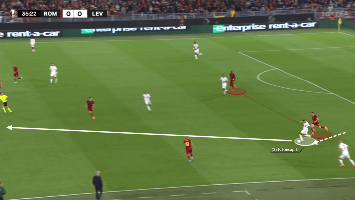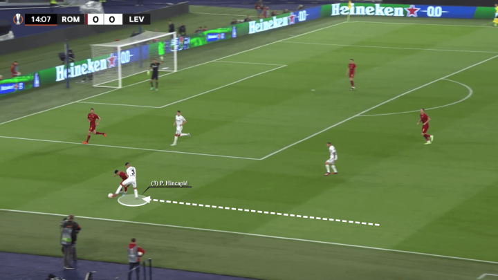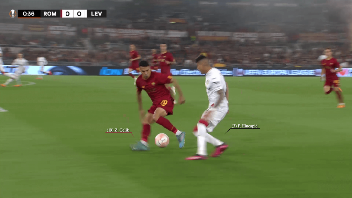 5月,勒沃库森迎来了对阵罗马的欧联半决赛。首回合,哈维·阿隆索的球队在意大利首都摆出了3-4-3阵型,因卡皮耶担任左翼卫。以下是因卡皮耶本场比赛的表现: