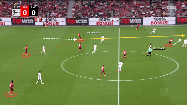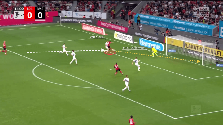 5月22日,勒沃库森主场2:2战平门兴格拉德巴赫,这2分之差就有可能让药厂不能进入欧战赛场。在这场比赛中,因卡皮耶在第15分钟为阿明·阿德利送出助攻,这与上述对阵罗马的传球类似——他先是持球带了几步,随即就送出纵贯中场区域的一脚向前传球: