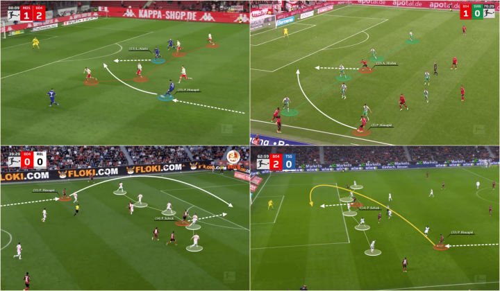 在对阵德甲第三RB莱比锡(今年4月)和第四名柏林联合(去年11月)的比赛中,勒沃库森在主场都取得了胜利。哈维·阿隆索在这两场比赛中都采用了3-4-3阵型,因卡皮耶担任左后卫,成为队内尝试传球次数最多的球员(2:0力克莱比锡一役46脚传球,5:0大胜柏林联合一役92脚传球):