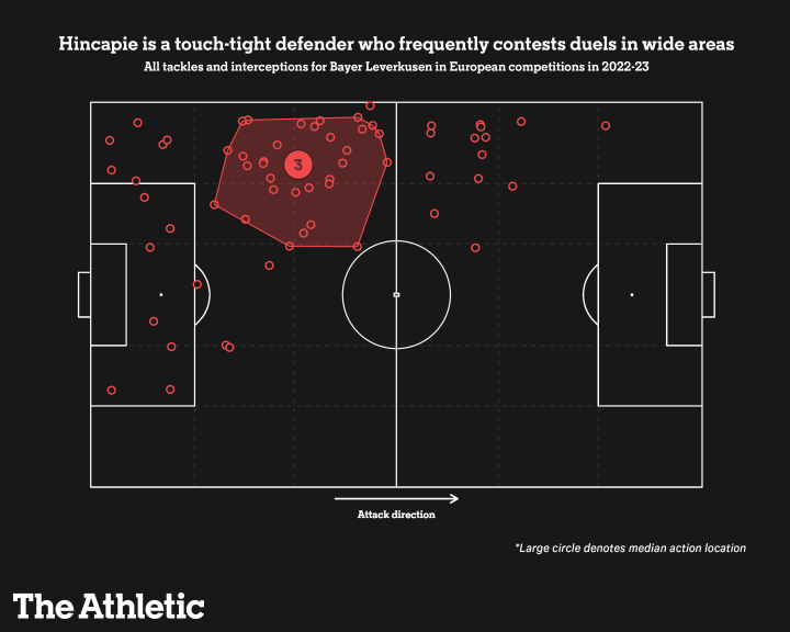 这张图显示了因卡皮耶作为一名非常喜欢身体对抗的球员,在边路和对手做对抗是最频繁的。图上的圆圈代表着因卡皮耶在上赛季德甲联赛中做出的每一次铲球和拦截。图示以从左向右作为进攻方向。