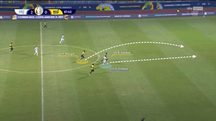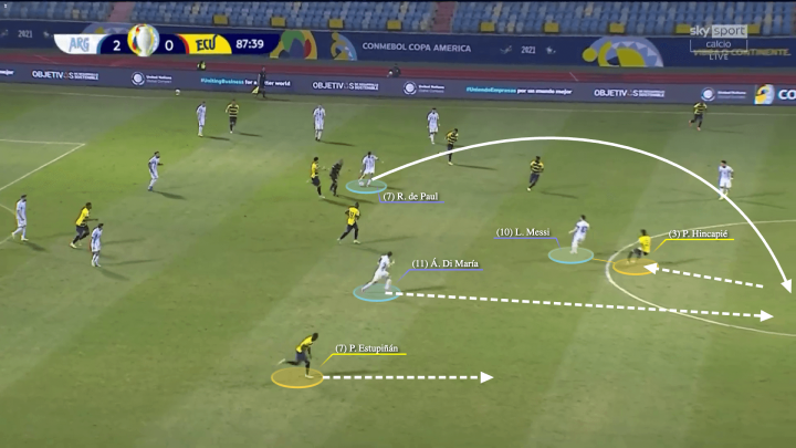 1.他正在试图接近梅西,但由于左后卫埃斯图皮尼安也处在高位,给迪·马利亚留出了打防线身后的空间: