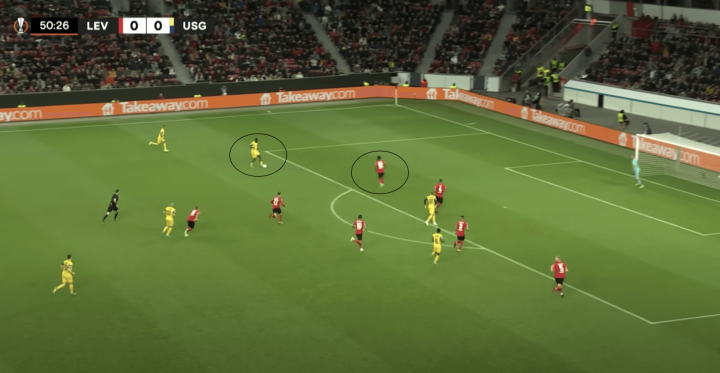 博尼费斯陷入一个很深的位置来争夺球权,然后赢得了球权,最后在三名防守队员之间送出一记传球,进入了一名正在插上的的边后卫的跑动路径。最终,对方一次出色的最后一搏,用铲球阻止了博尼法斯的进球,但这有力地证明了博尼费斯在进攻纵深(from deep)的价值和他潜在的组织进攻的能力: