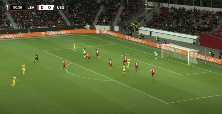2.而且维尔茨也会回到禁区提供帮助,但博尼费斯没有寻找同处左侧与他做出叠瓦式跑动(overlap)的那名球员,而是与塔普索巴交锋,利用脚后跟让他的重心后移,然后直接射门,球飞入远角。真是太棒了!伪装得如此之好,射得如此之快,以至于尽管身高193cm的埃德蒙·塔普索巴,能够阻挡大部分的角度,但却根本无法做出反应,直到为时已晚: