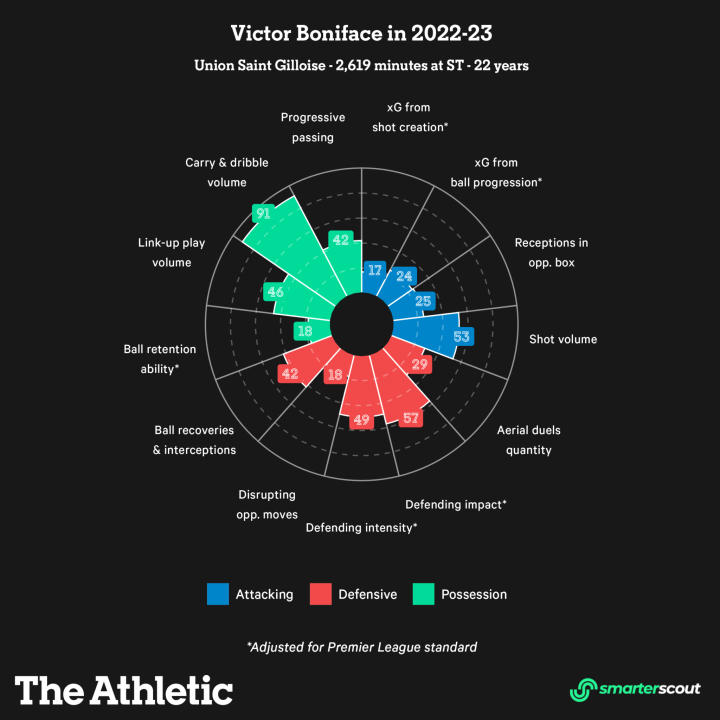 他们会看到的是一个能够以各种方式取得的球员。在效力于圣吉罗斯联合的一个赛季中,博尼费斯展示了他可以用右脚和左脚,用脚外侧和脚内侧实现终结。他还证明了自己在空中也是可怕的,头球能够产生巨大的力量,在传中的时候也是如此。但那些勒沃库森球探也会看到一名不仅仅是能够进球的球员,他可能有一些特质,这些特质表明他正在进化为一名非常不寻常但接近完美的中锋。