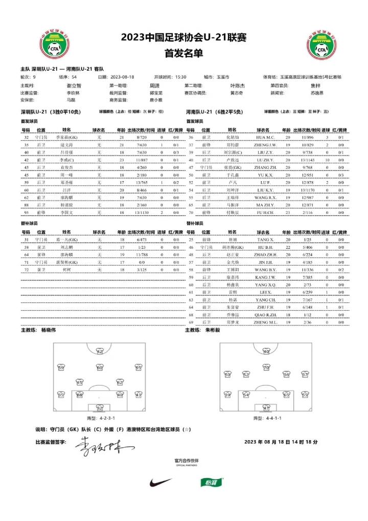 U21 | 河南队3-2 深圳队 卢凡、卢致远破...河南足球俱乐部 @懂球帝2023-08-19 13:37U21 | 河南队3-2 深圳队 卢凡、卢致远破门 8月18日,2023中国足球协会U-21联赛决赛第二阶段第9轮,河南U21 对阵深圳U21。 上半场,双方均无进球。下半场,深圳队乌龙,卢凡、卢致远接连进球。最终,河南3-2击败深圳,迎来第二阶段开局三连胜。北京时间8月20 日 15:30,河南队将迎战沧州雄狮。展开更多