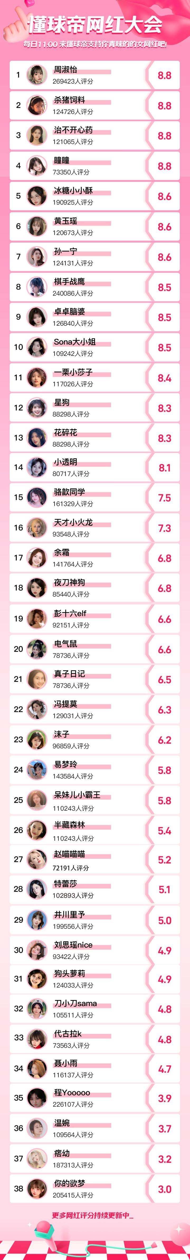 当前我懂老哥对各大网红们的喜爱值如下,谁最让你意外?你最中意的女网红是哪个?欢迎大家在评论区提名,活动君将会根据大家的提名结果判断采纳哦!