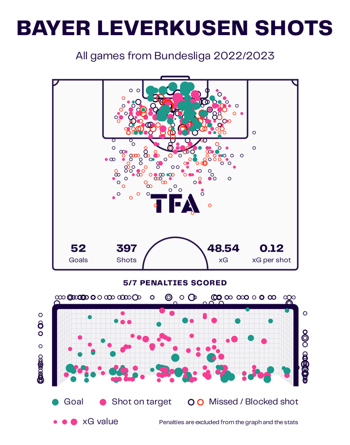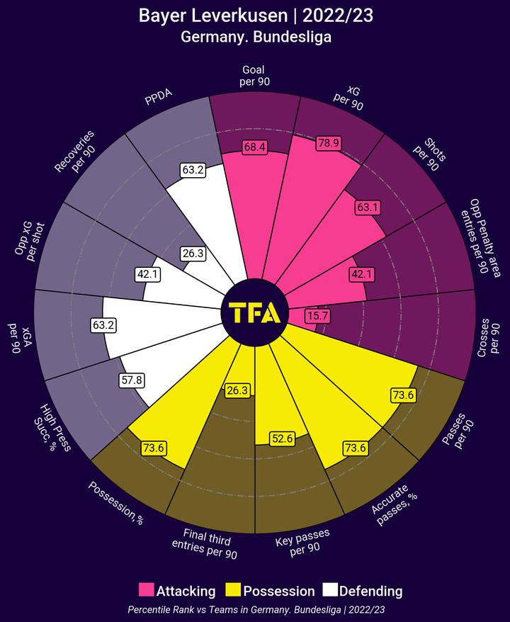 在阿隆索的指导下,勒沃库森的进攻能力大放异彩,整个赛季打进了57球,成为联赛进球数第六高的球队。勒沃库森平均每90分钟进球1.56个,超过了他们自己的预期进球(xG)总值53.86,展示了他们在球门前的出色表现和效率。